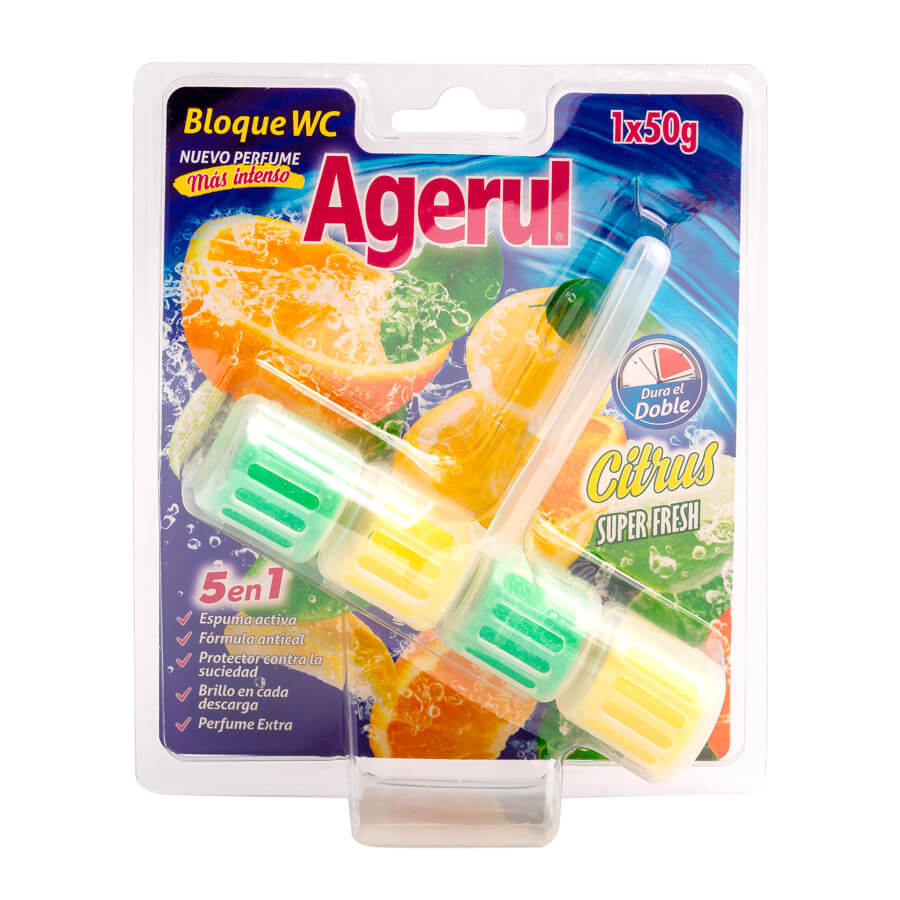 El bloque de WC Brisa Citrus de Agerul es un potente limpiador y ambientador del inodoro. Mantiene siempre fresco el sanitario y además aporta 5 efectos extra para una experiencia superfresh.